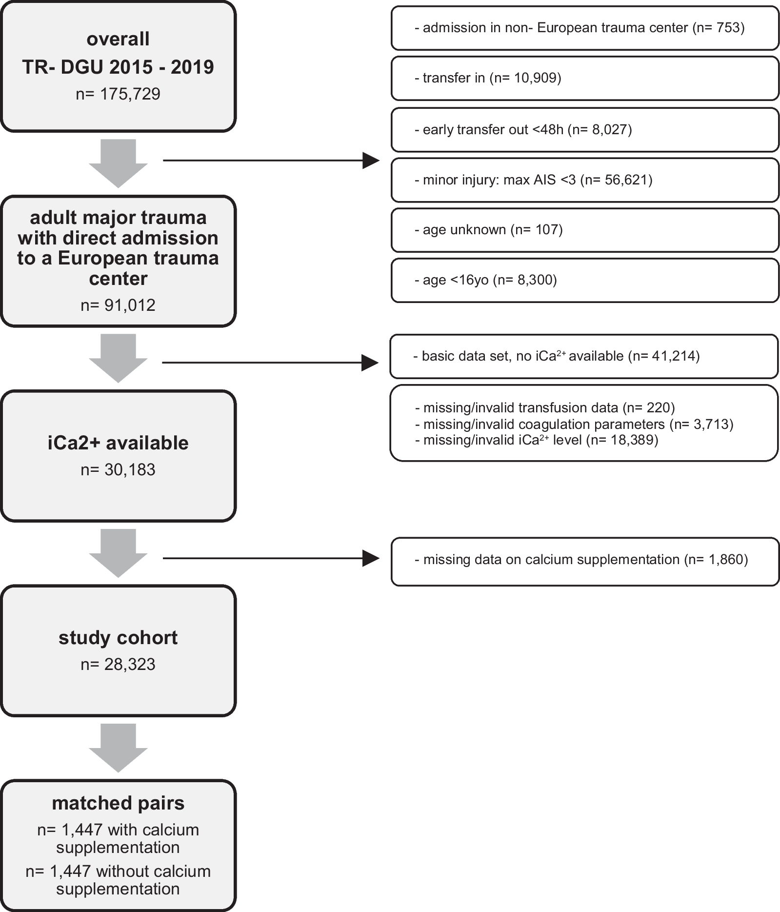 We conducted a retrospective analysis using data from the TraumaRegister DGU® (2015–2019), applying propensity score matching to balance demographics, injury severity, and management between major trauma patients with and without calcium supplementation. 6 h mortality, 24 h mortality, and in-hospital mortality were considered as primary outcome parameters.