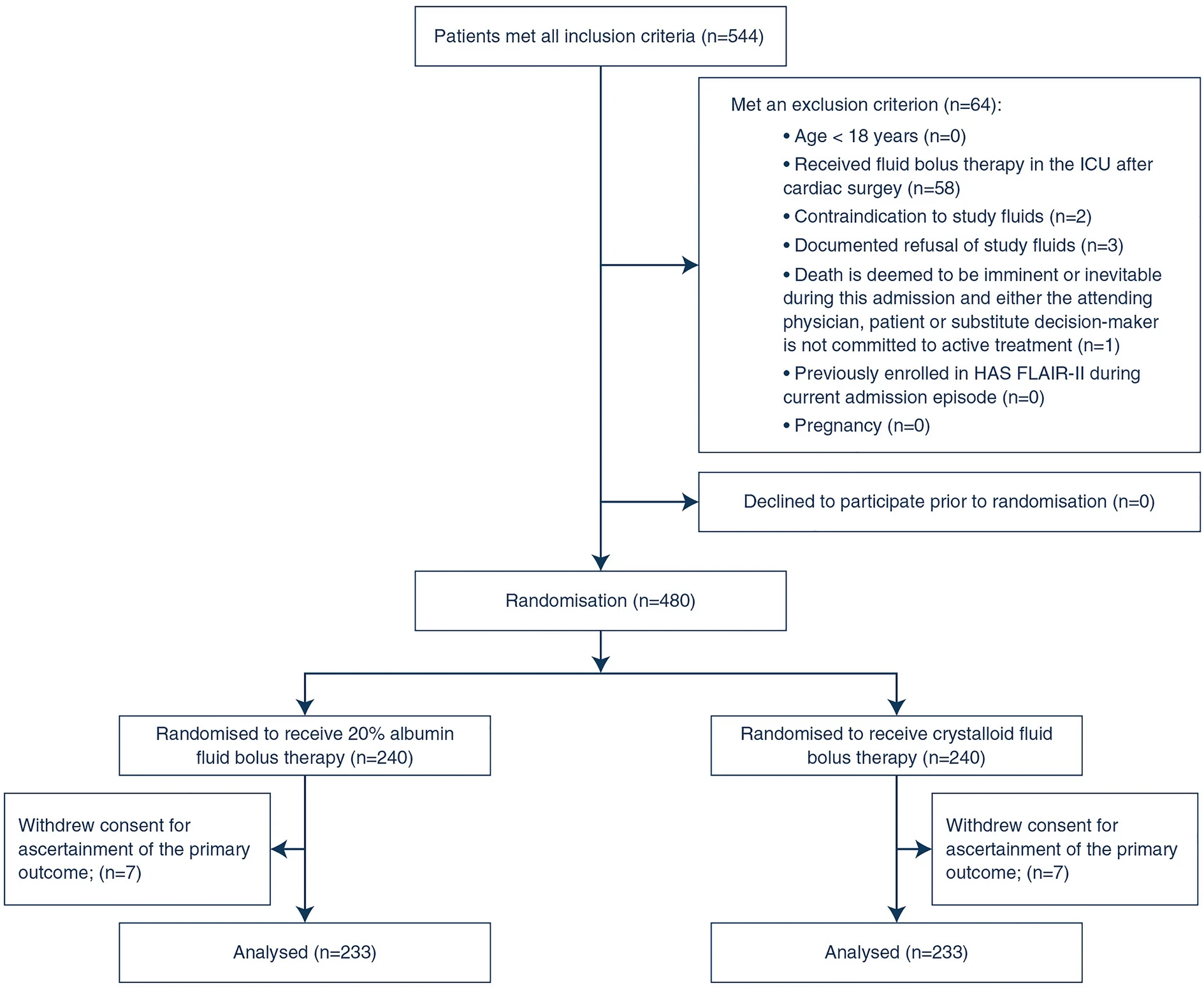 Of 480 randomised patients, 466 provided consent and contributed to the primary outcome (mean age 65 years; median EuroSCORE II 1.4). The cumulative median duration of vasopressor therapy was 7 (interquartile range [IQR] 0–19.6) hours with 20% albumin and 10.8 (IQR 0–22.8) hours with crystalloids (difference − 3.8 h, 95% confidence interval [CI] − 8 to 0.4; P = 0.08). Day one fluid balance was less with 20% albumin FBT (mean difference − 701 mL, 95% CI − 872 to − 530).