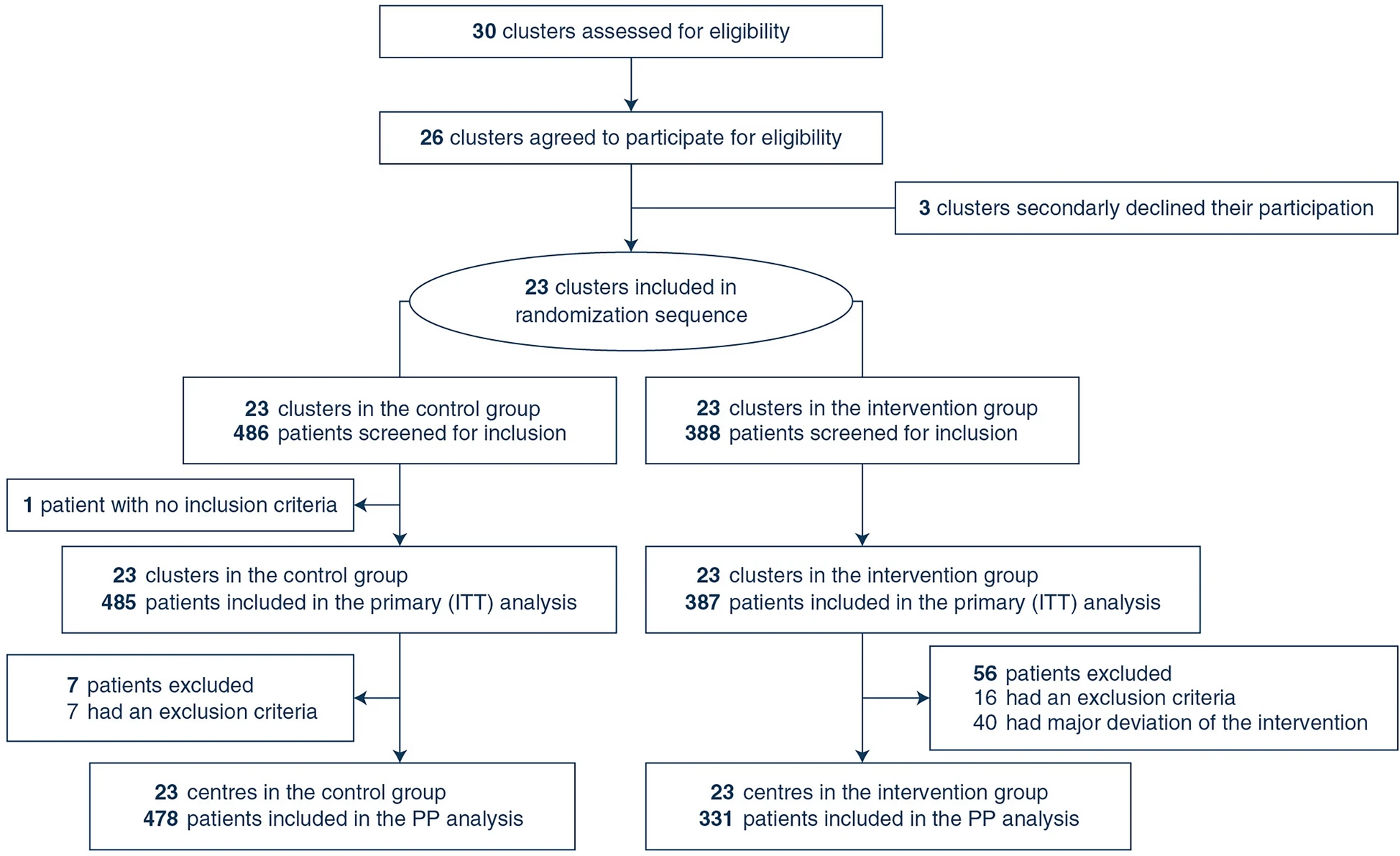 We carried out a pragmatic stepped-wedge cluster-randomized trial in 23 EDs in France and Spain. Adult patients with Sepsis-3 criteria or a quick sequential organ failure assessment (SOFA) score ≥ 2 or a lactate > 2 mmol/L were eligible. The intervention was the implementation of the 1-h sepsis bundle. The primary outcome was in-hospital mortality truncated at 28 days. Secondary outcomes included volume of fluid resuscitation at 24 h, acute heart failure at 24 h, SOFA score at 72 h, intensive care unit (ICU) length of stay, number of days on mechanical ventilation or renal replacement therapy, vasopressor free days, unnecessary antibiotic administration, and mortality at 28 days. 1148 patients were planned to be analysed; the study period ended after 873 patients were included.