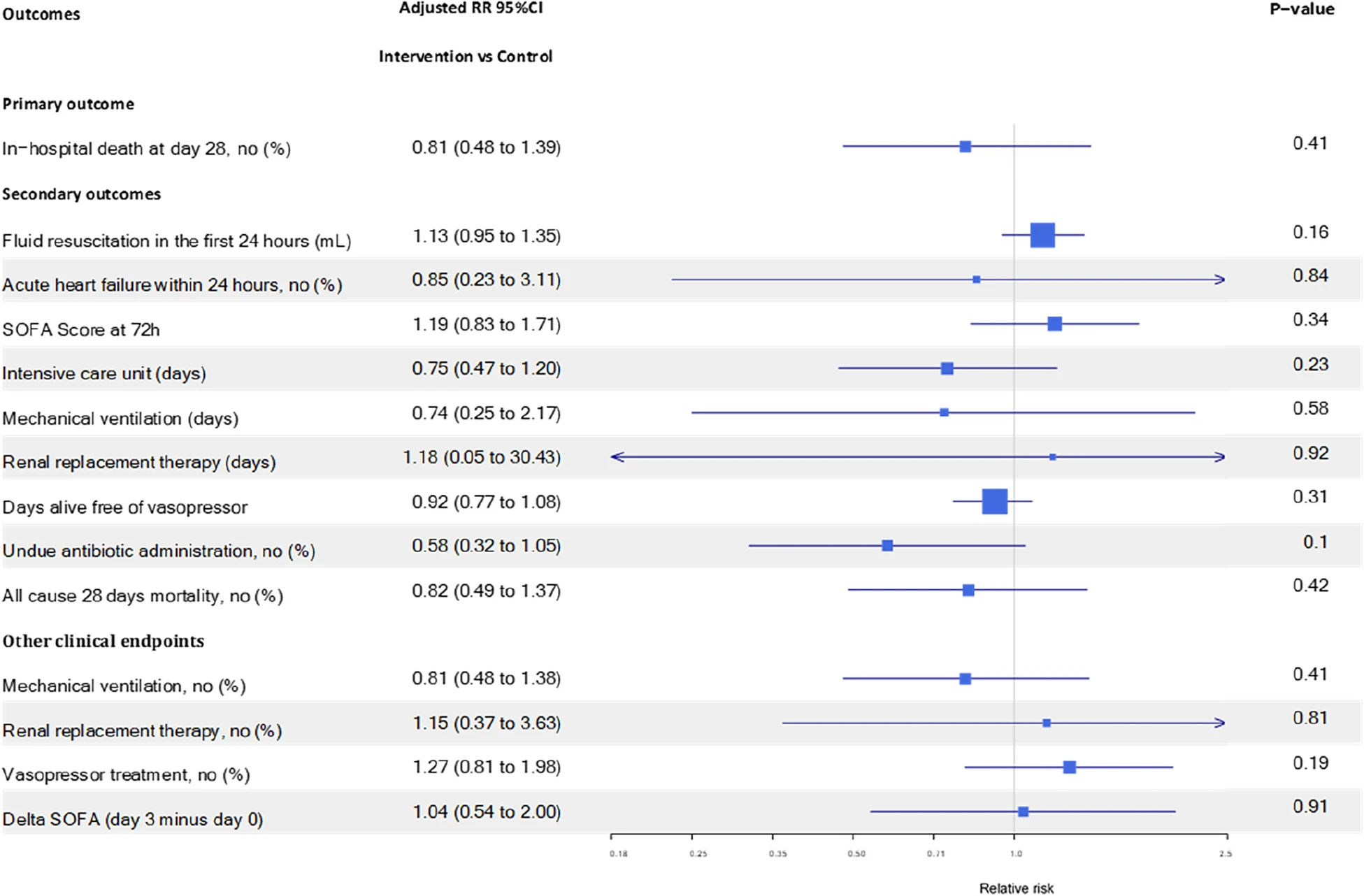 872 patients (mean age 66, 42% female) were analyzed: 387 (44.4%) in the intervention group and 485 (55.6%) in the control group. Median SOFA score was 3 [1–5]. Median time to antibiotic administration was 40 min in the intervention group vs 113 min in the control group (difference − 73 [95% confidence interval (CI) − 93 to − 53]). There was a significantly higher rate, volume, and shorter time to fluid resuscitation within 3 h in the intervention group. There were 47 (12.1%) in-hospital deaths in the intervention group compared to 61 (12.6%) in the control group (difference in percentage − 0.4 [95% CI − 5.1 to 4.2], adjusted relative risk (aRR) 0.81 [95% CI 0.48 to 1.39]). There were no differences between groups for other secondary endpoints.