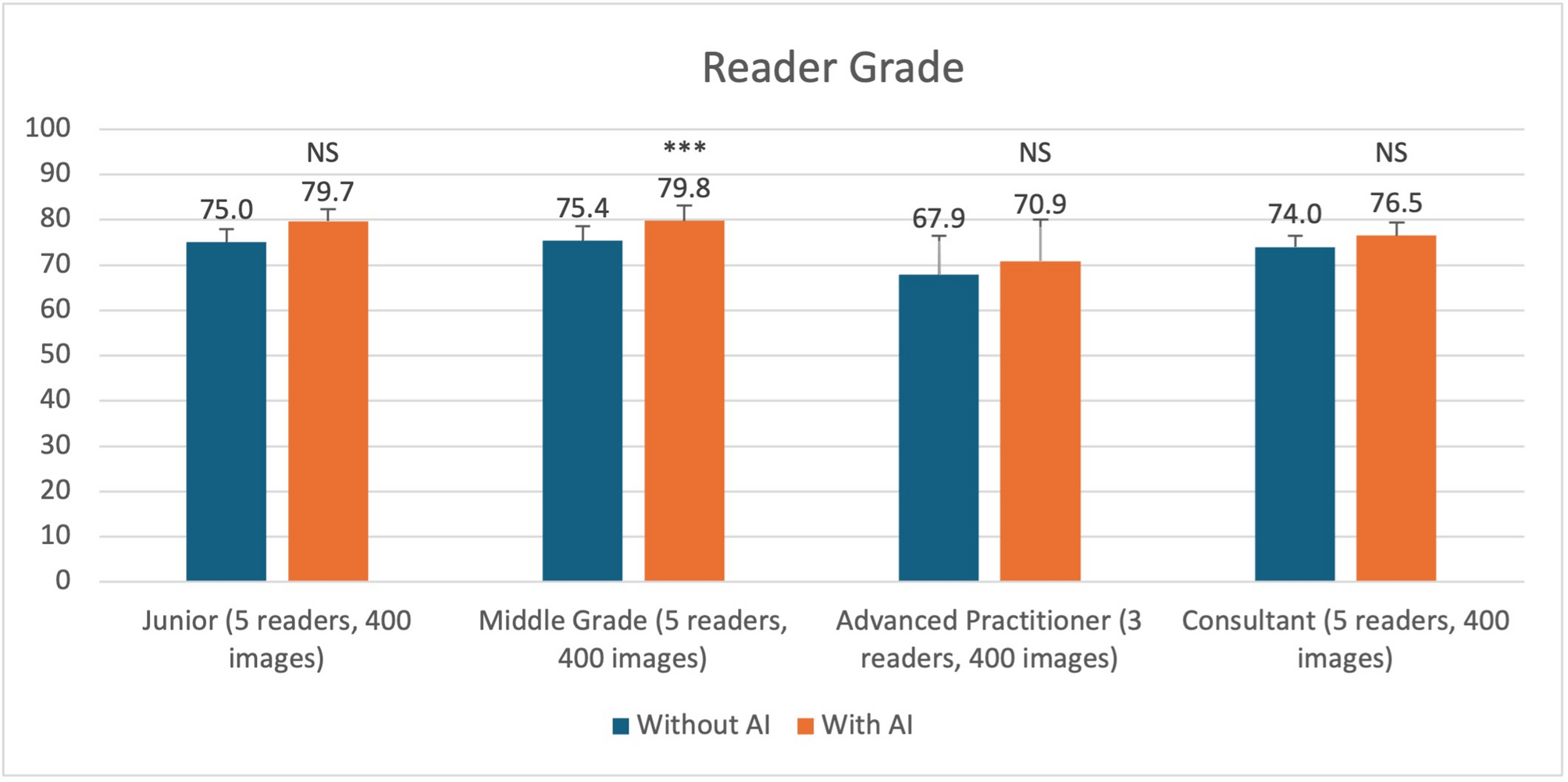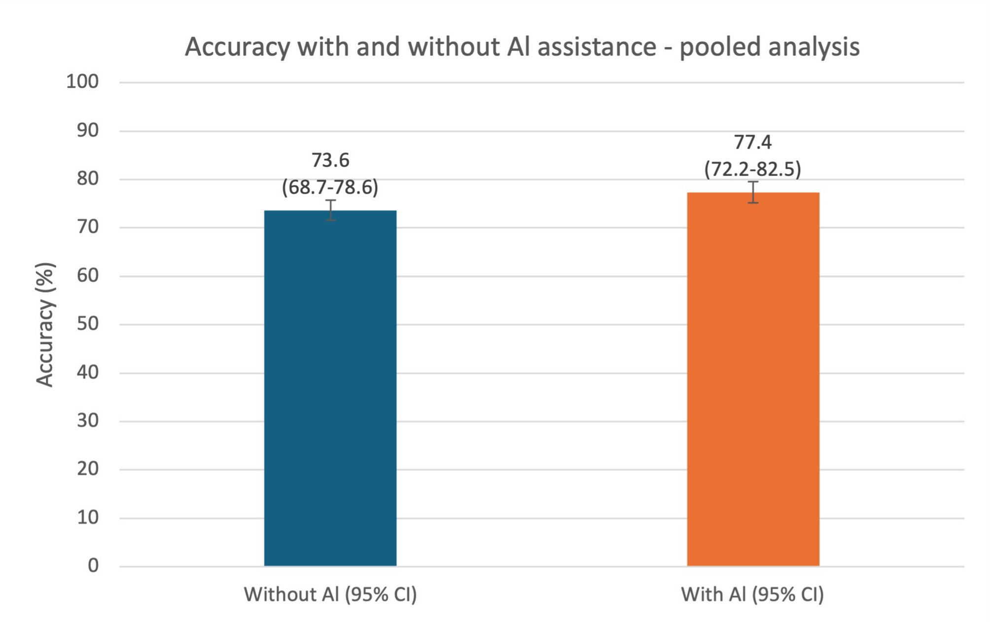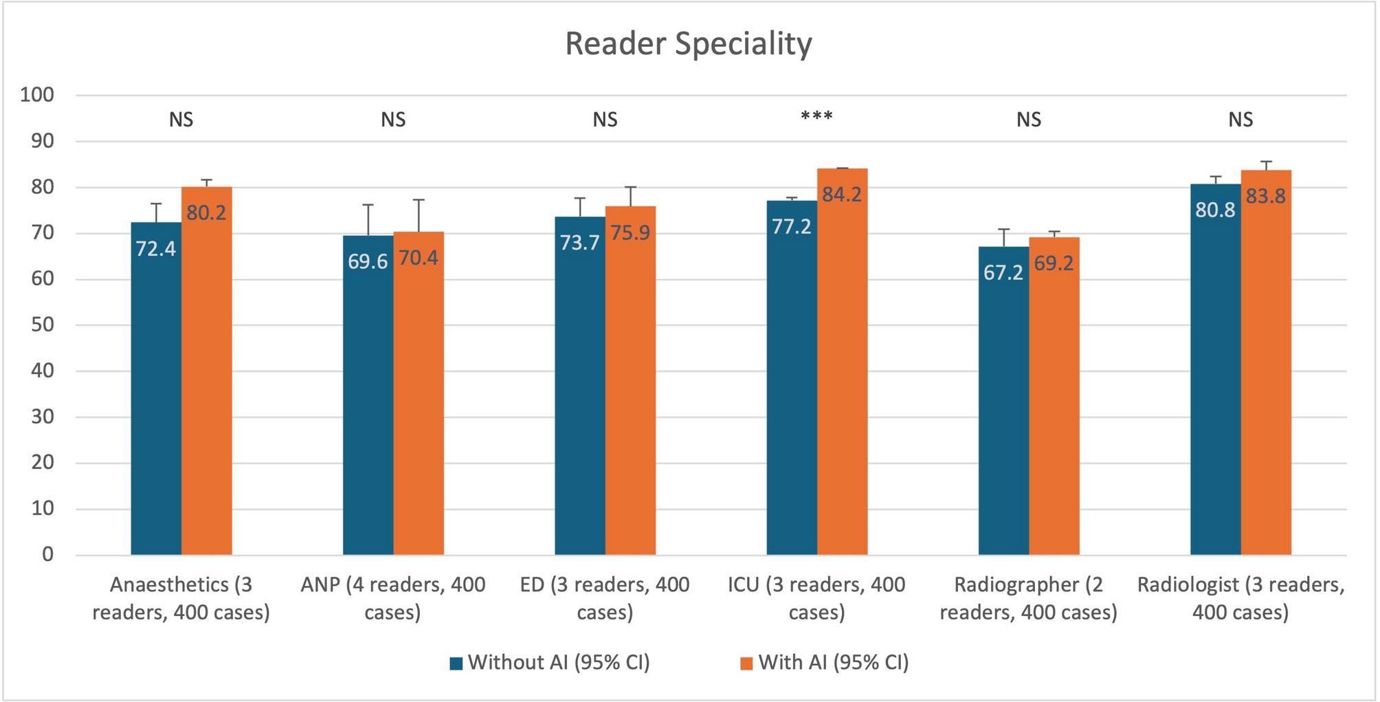 Four hundred CXRs of intubated adult patients were retrospectively sourced from the John Radcliffe Hospital (Oxford) and two other UK NHS hospitals. Images were de-identified and selected from a range of clinical settings, including the intensive care unit (ICU) and emergency department (ED). Each image was independently reported by a panel of thoracic radiologists, whose consensus classification of ETT placement (correct, too low [distal], or too high [proximal]) served as the reference standard for the study. Correct ETT position was defined as the tip located 3–7 cm above the carina, in line with established guidelines. Eighteen clinical readers of varying seniority from six clinical specialties were recruited across four NHS hospitals. Readers viewed the dataset using an online platform and recorded a blinded classification of ETT position for each image. After a four-week washout period, this was repeated with assistance from an AI-assisted image interpretation tool. Reader accuracy, reported confidence, and timings were measured during each study phase.