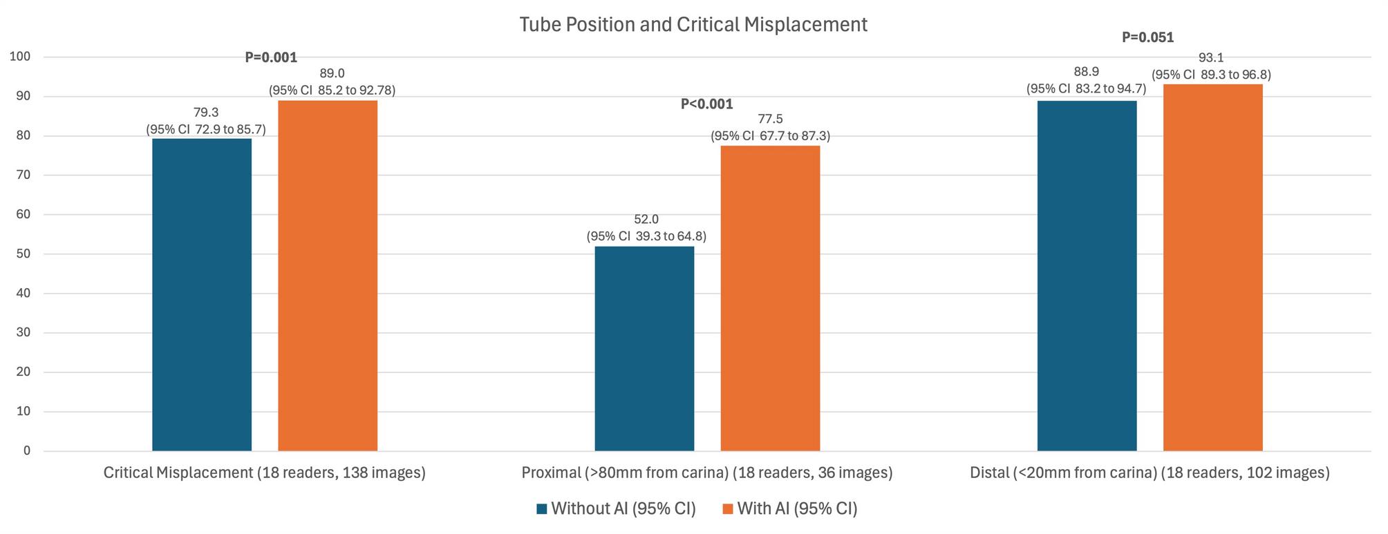 14,400 image interpretations were undertaken. Pooled accuracy for tube placement classification improved from 73.6 to 77.4% (p = 0.002). Accuracy for identification of critically misplaced tubes increased from 79.3 to 89.0% (p = 0.001). Reader confidence improved with AI assistance, with no change in mean interpretation time at 36 s per image.