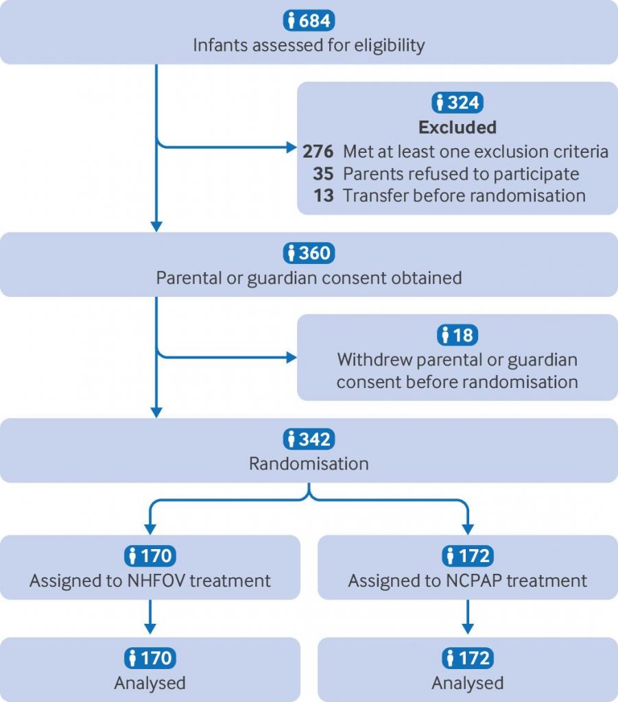 Interventions Participants were randomly allocated to receive NCPAP or NHFOV as primary respiratory support for respiratory distress syndrome.