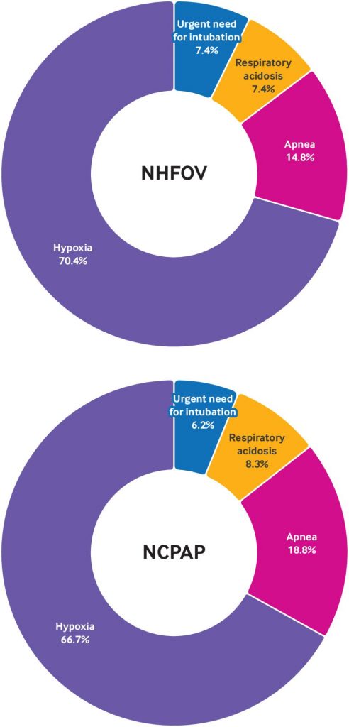Results Treatment failure within 72 hours occurred in 27 of` 170 infants (15.9%) in the NHFOV group and 48 of 172 infants (27.9%) in the NCPAP group (risk difference −12.0 percentage points, 95% confidence interval −20.7 to −3.4; P=0.007). Treatment failure within seven days was also lower in the NHFOV group (−12.5 percentage points, 95% confidence interval −21.9 to −3.2; P=0.008) compared with the NCPAP group. All observed associations remained significant after sensitivity analysis including study sites and antenatal steroid use. No significant differences were found in any other secondary outcomes between the two groups.