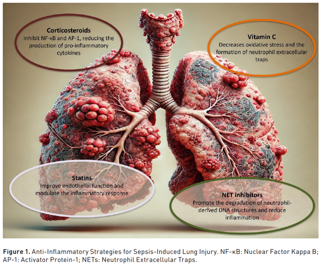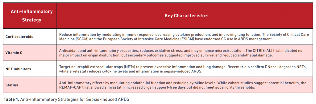 Sepsis-induced ARDS is a critical condition that may require anti-inflammatory strategies. There are some promising treatments that may alter the evolution, including corticosteroids, vitamin C, NET inhibitors, and statins, which help mitigate excessive immune response and improve clinical outcomes.