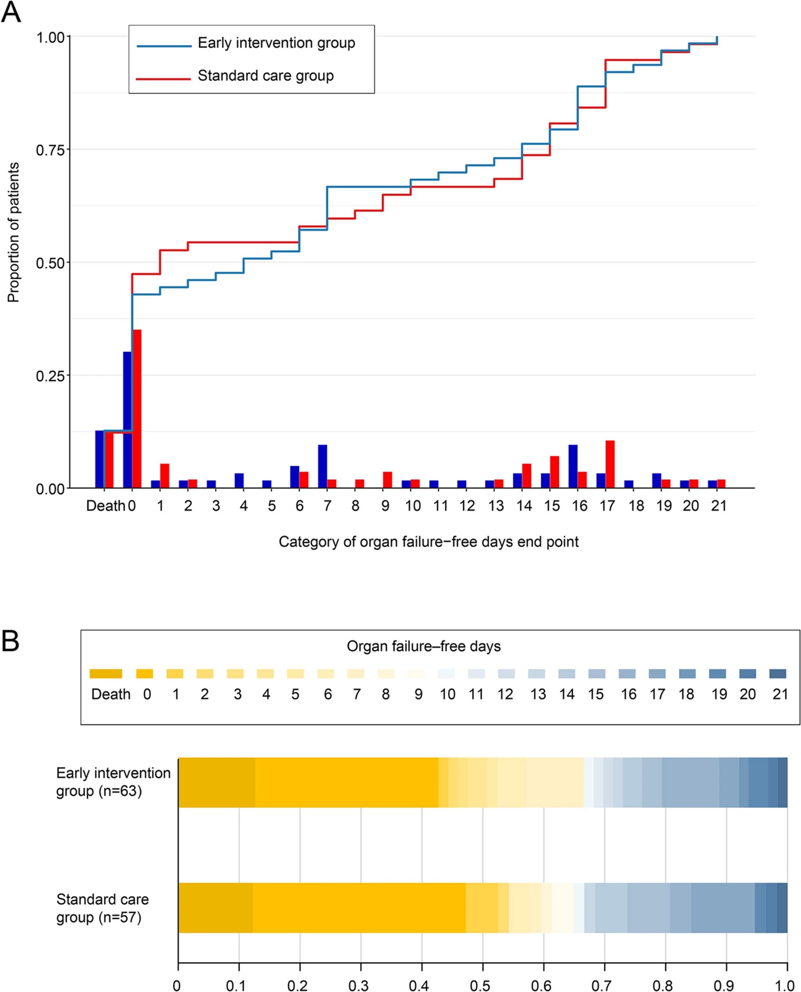Overall, 120 patients were randomized to early intervention (N = 63) or standard care (N = 57). There was no difference in the primary composite outcome (33.3% [21/63] versus 36.8% [21/57]; risk difference [RD] − 3.5%; 95% CI, − 20.6 to 13.6%) or the individual components, including mortality. The study groups did not differ in terms of organ failure free days to 21 days after randomization (4 days [interquartile range 0–14] versus 1 day [interquartile range 0–15]). The requirement for minimally invasive debridement and open surgery was comparable between groups.