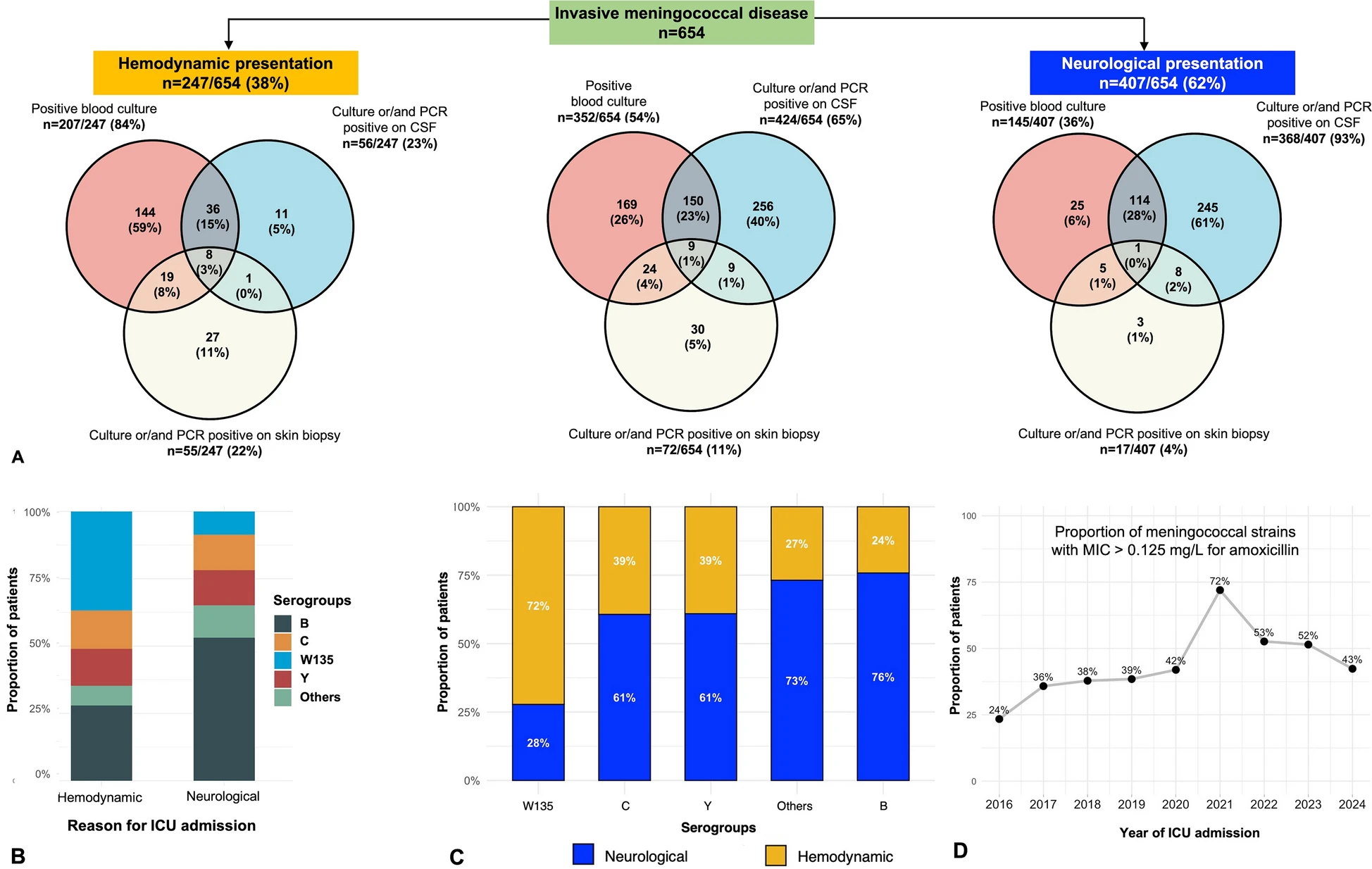 Invasive meningococcal disease (IMD) is a rare but potentially fatal infection caused by Neisseria meningitidis. In adults requiring admission to intensive care unit (ICU), IMD typically presents with two distinct clinical presentations: neurological (meningitis) and hemodynamic (sepsis). These presentations are often conflated, despite the differences in pathophysiology and outcome.
