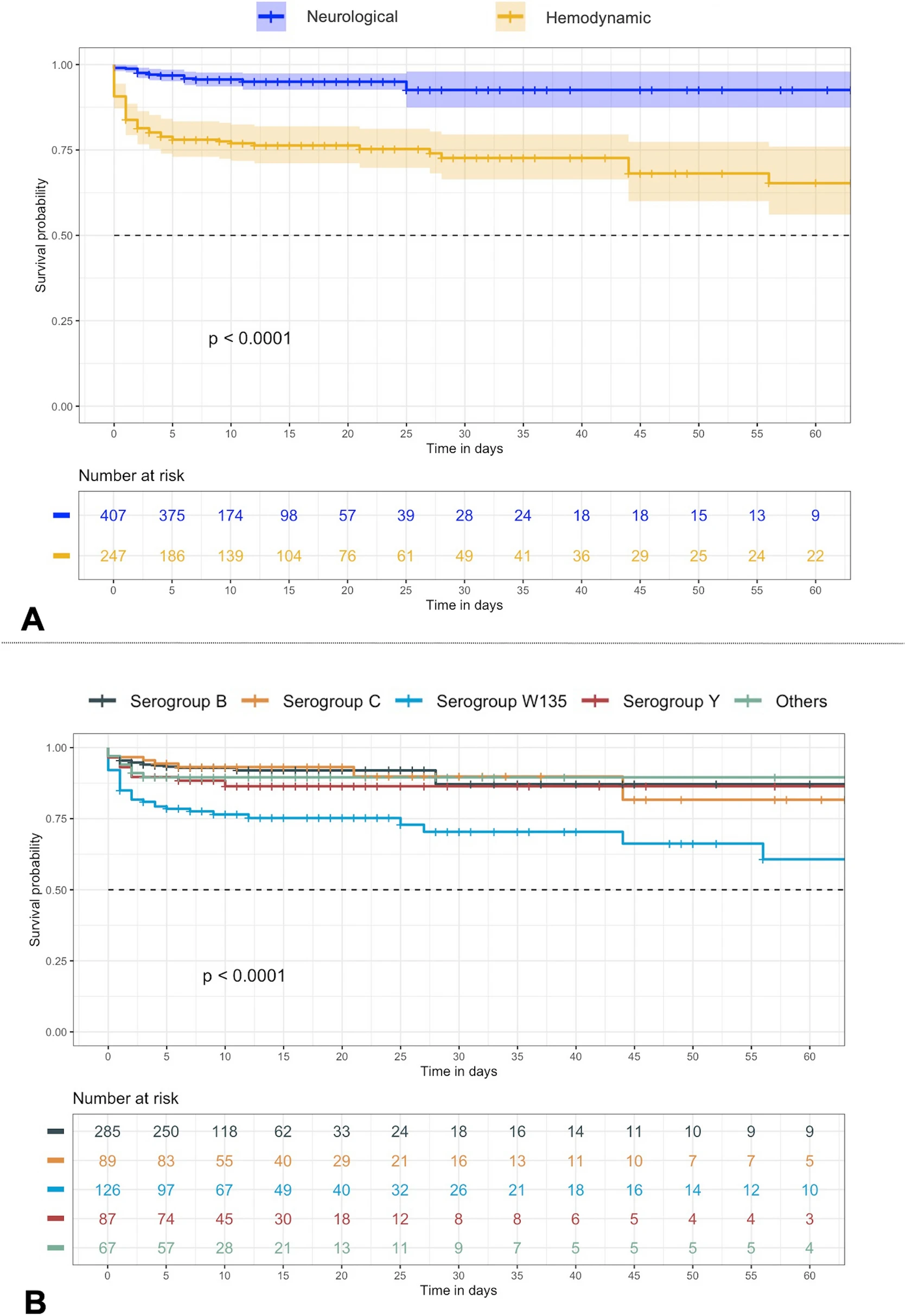 Of 654 patients (median age 33 years [IQR 21–56]; 63.5% without comorbidities), 407 (62%) had a neurological and 247 (38%) a hemodynamic presentation at ICU admission. Hemodynamic presentation was associated with older age (39.0 vs. 30.0 years; p = 0.001), immunosuppression (17.0% vs. 7.1%; p < 0.001), purpuric rash (55.9% vs. 43.7%; p = 0.003), earlier ICU admission (1 vs. 2 days; p = 0.001) and more frequent bacteremia (83.8% vs. 35.6%; p < 0.001). Serogroup B was predominant in neurological presentation, whereas serogroup W135 was more common in hemodynamic presentation. Compared to neurological presentation, hemodynamic presentation required more organ support (vasopressors, invasive mechanical ventilation, transfusions, renal replacement therapy) and had a significantly higher day-60 mortality (25.5% vs. 4.7%; p < 0.001). Hemodynamic presentation (aOR 4.33, 95% CI 2.26–8.62; p < 0.001), absence of comorbidities (aOR 2.21, 95% CI 1.19–4.23; p = 0.014), age > 35 years (aOR 3.65, 95% CI 1.73–6.07; p < 0.001), arterial lactate level > 5 mmol/L (aOR 2.60, 95% CI 1.43–4.77; p = 0.002) and symptom onset < 24 h (aOR 1.90, 95% CI 1.00–3.55; p = 0.040) were independently associated with day-60 mortality, while early administration of a parenteral third-generation cephalosporin prior to ICU admission was strongly protective (aOR 0.31, 95% CI 0.18–0.55; p < 0.001).