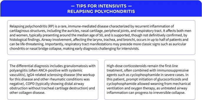 Relapsing polychondritis (RP) is a rare, immune-mediated disease characterized by recurrent inflammation of cartilaginous structures, including the auricles, nasal cartilage, peripheral joints, and respiratory tract (Fig. 1). It affects both men and women, typically presenting around the median age of 50, and is supported, though not definitively confirmed, by histological findings. Airway involvement, affecting the larynx, trachea, and bronchi, occurs in up to half of patients and can be life-threatening. Importantly, respiratory tract manifestations may precede more classic signs such as auricular chondritis or nasal bridge collapse, making early diagnosis challenging for intensivists.