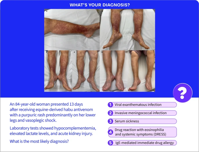 Serum sickness typically manifests 7–14 days after exposure to heterologous proteins, such as antivenoms, some vaccines, and immune-modulating agents (e.g., rituximab and infliximab). Most cases resolve with withdrawal of the offending agent; however, severe systemic involvement may require corticosteroids. Purpuric lesions together with hypotension, tachypnea, and elevated lactate can also raise concern for invasive pneumococcal or meningococcal infection. Accordingly, septic shock ranked high in the differential, and empiric meropenem was initiated. It is a diagnostic challenge to distinguish serum sickness from sepsis (Fig. 1).