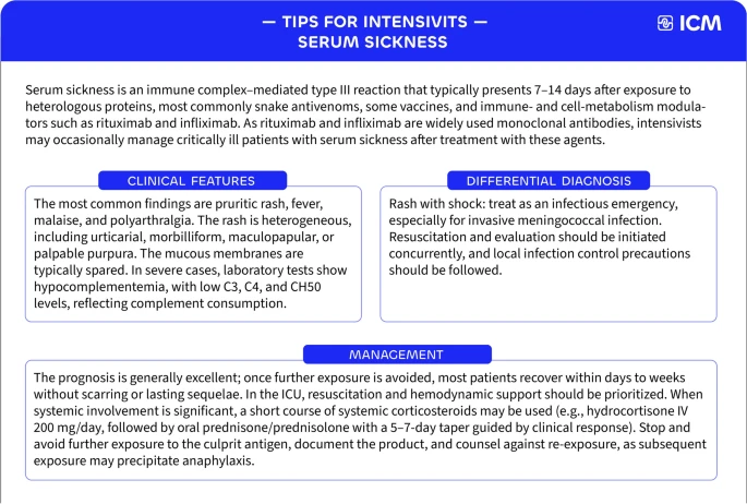 Serum sickness is an immune complex-mediated type III reaction that typically presents 7–14 days after exposure to heterologous proteins, most commonly snake antivenoms, some vaccines, and immune- and cell-metabolism modulators, such as rituximab and infliximab. As rituximab and infliximab are widely used monoclonal antibodies, intensivists may occasionally manage critically ill patients with serum sickness after treatment with these agents.
