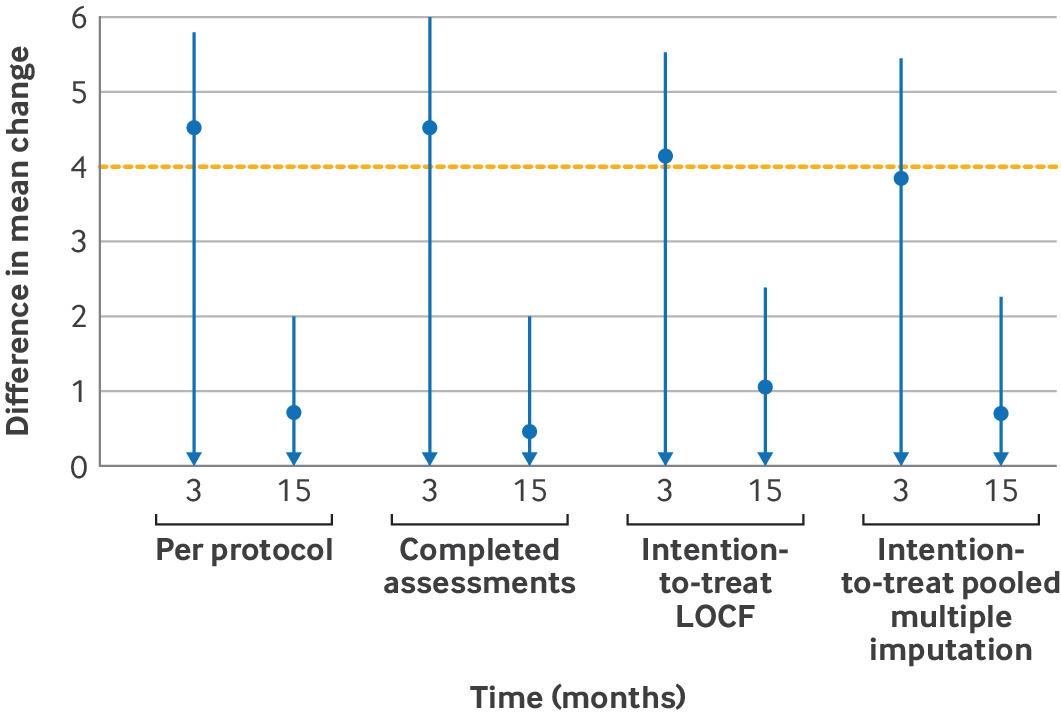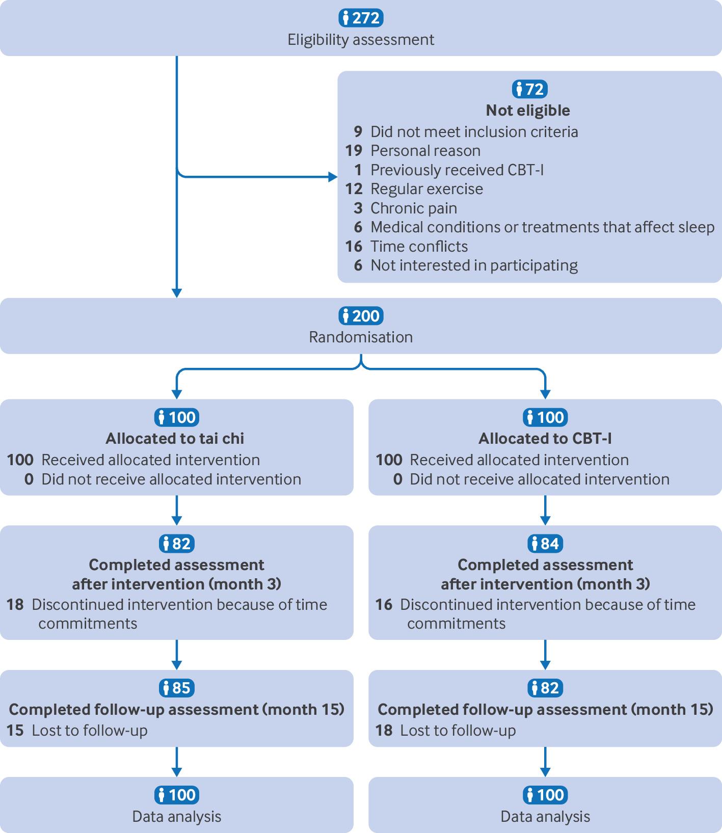 Results 200 participants were randomised (1:1) to receive tai chi (n=100) or CBT-I (n=100). The per protocol principle was adopted. At month 3, the tai chi group showed a reduction of 6.67 (95% confidence interval 5.61 to 7.73) in Insomnia Severity Index scores, while the CBT-I group had a reduction of 11.19 (10.06 to 12.32), resulting in a between group difference of 4.52 (−∞ to 5.81). Tai chi was deemed inferior to CBT-I at month 3 because the upper confidence limit exceeded the non-inferiority margin. At month 15, the reductions for tai chi and CBT-I were 9.51 (8.47 to 10.54) and 10.18 (8.97 to 11.40), respectively, with a between group difference of 0.68 (−∞ to 2.00). At this point, tai chi was considered non-inferior to CBT-I because the upper confidence limit fell within the non-inferiority margin. Results from the intention-to-treat analysis were consistent with the per protocol findings. No adverse events occurred during the intervention period.
