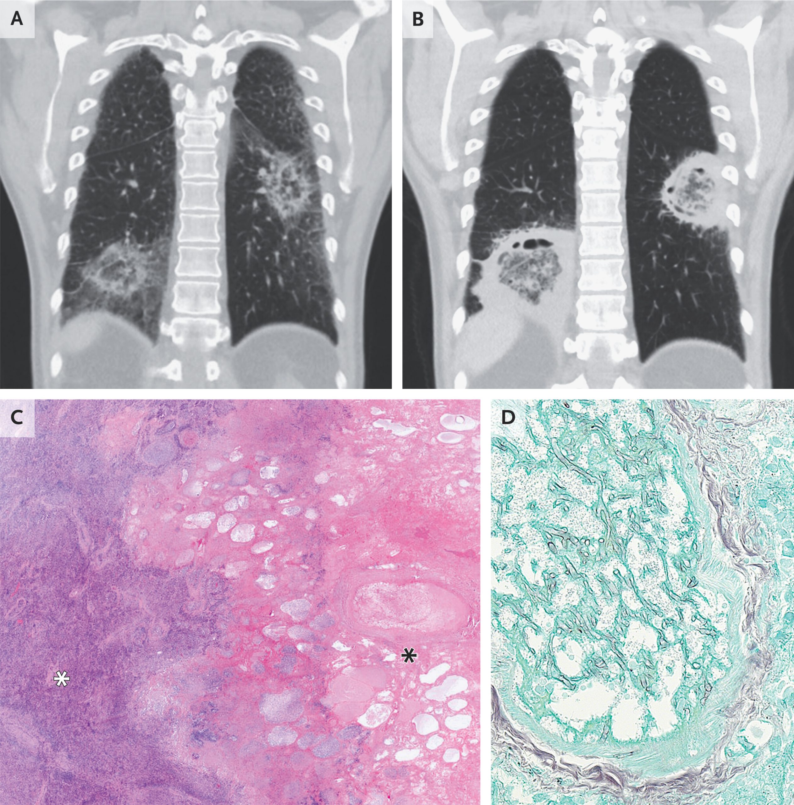 A 49-year-old man with acute myeloid leukemia who had been admitted to the hospital for induction chemotherapy was evaluated for prolonged neutropenic fever. On physical examination, crackles were heard at the lung bases. Computed tomography (CT) of the chest revealed rounded opacities with central ground-glass attenuation and ringlike peripheral consolidation in both lungs (Panel A, coronal view) — a finding known as the reversed halo sign that can occur with invasive fungal infections. Treatment with amphotericin B was started. A polymerase-chain-reaction (PCR) assay for mucorales species in bronchoalveolar lavage fluid was positive. After 2 weeks of treatment, repeat CT of the chest revealed increased attenuation of the ringlike peripheral consolidations and central cavitation of the opacities (Panel B, coronal view), findings consistent with neutrophil recovery. Surgical resection was performed. Histopathological analysis of the resected lung tissue showed central necrosis (Panel C, black asterisk; hematoxylin and eosin stain) surrounded by organizing pneumonia (Panel C, white asterisk). Intravascular hyphae were also seen (Panel D, Grocott’s methenamine silver stain). PCR analysis of the resected tissue identified Rhizomucor pusillus, which confirmed the diagnosis of pulmonary mucormycosis. One week after surgery, the patient was discharged home with a prescription for isavuconazole for secondary prophylaxis. Two weeks later, he underwent allogeneic hematopoietic stem-cell transplantation