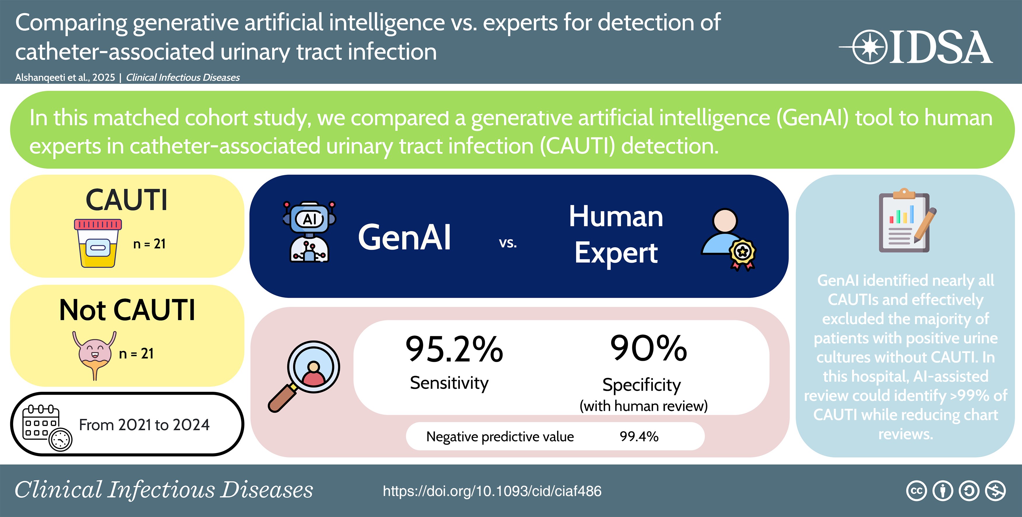 In a single hospital matched cohort study reviewing all CAUTIs for 4 years, we found GenAI identified nearly all CAUTIs and effectively excluded the majority of patients with positive urine cultures without CAUTI. Notably, the reference standard expert CAUTI review was incorrect 1 time that was identified by GenAI, and most errors of GenAI could be identified by an expert human reviewer based on GenAI output. CAUTI is an important HAI that must be reported by US hospitals and is tied to reimbursement. HAI surveillance and reporting generally requires a substantial portion of expert IC nurse time, up to 61% of all activities [8]. HAI reporting distracted from other activities for nearly all IC nurses [9]. The amount of time spent by IC expert for a manual review and surveillance is variable but can reach up to half the working hours [2]. This can potentially be reduced as the time spent to review one case using GenAI ranged between 10 and 15 minutes. The potential to automate or semi-automate reporting could improve efficiency of expert IC nurses. Our findings suggest that GenAI is best used to augment the performance of expert reviewers but not replace human review. Furthermore, it may improve equity in resource-limited settings that have fewer highly trained reviewers.