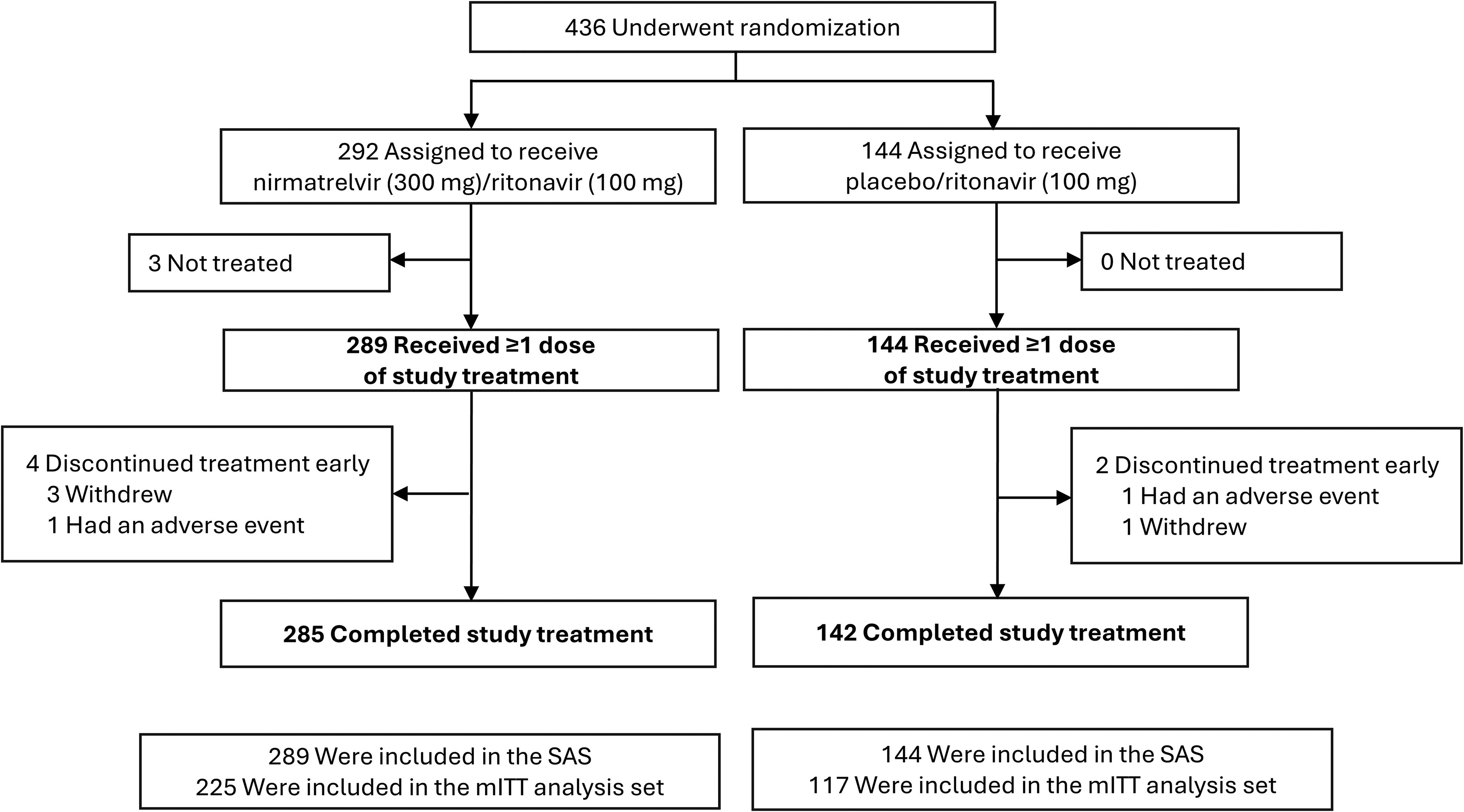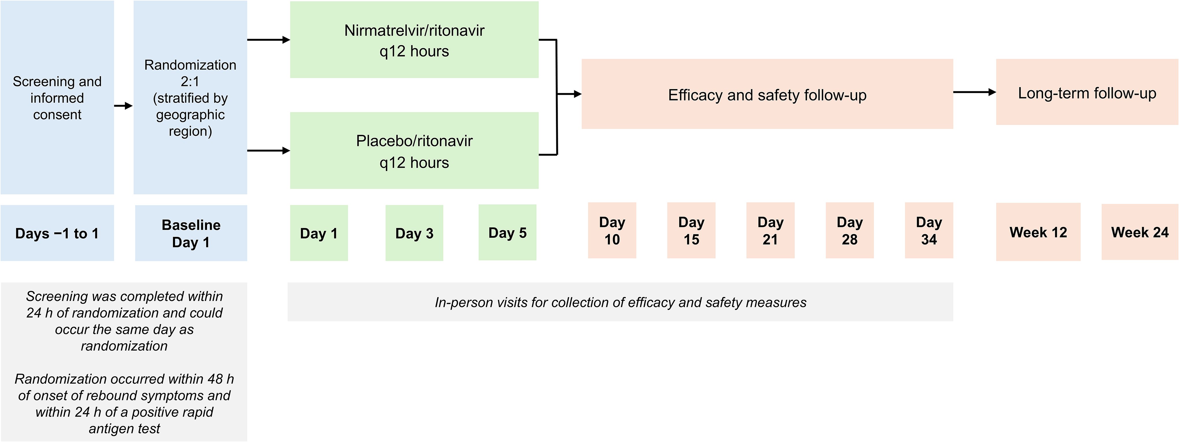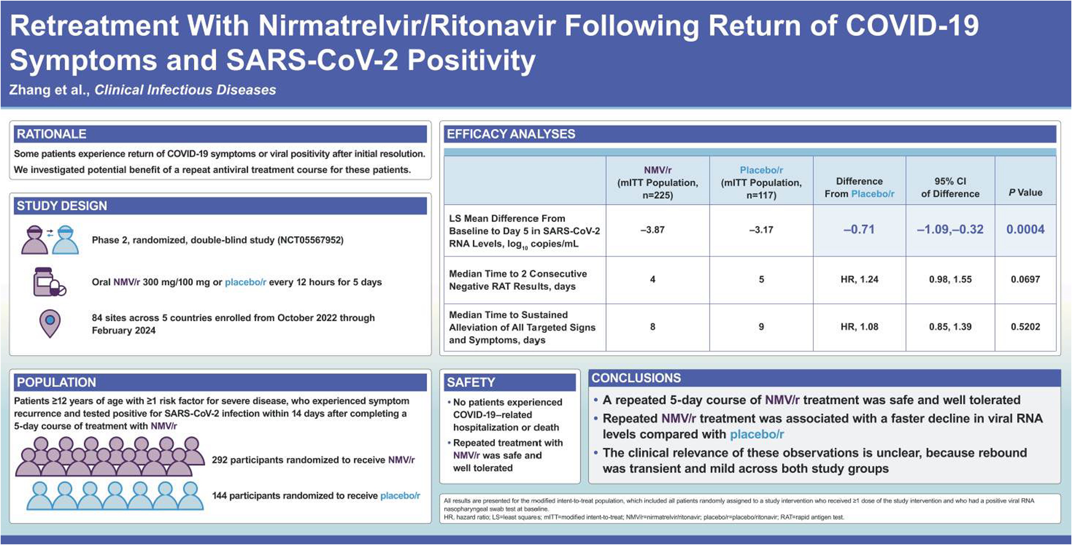 This randomized, double-blind, placebo-controlled clinical trial evaluated the efficacy and safety of a second 5-day treatment course of nirmatrelvir/ritonavir versus placebo/ritonavir in participants with symptomatic mild to moderate COVID-19 with a positive severe acute respiratory syndrome coronavirus 2 (SARS-CoV-2) rapid antigen test within 14 days of initial nirmatrelvir/ritonavir treatment. The primary efficacy endpoint was the change in viral SARS-CoV-2 RNA level from baseline to Day 5.