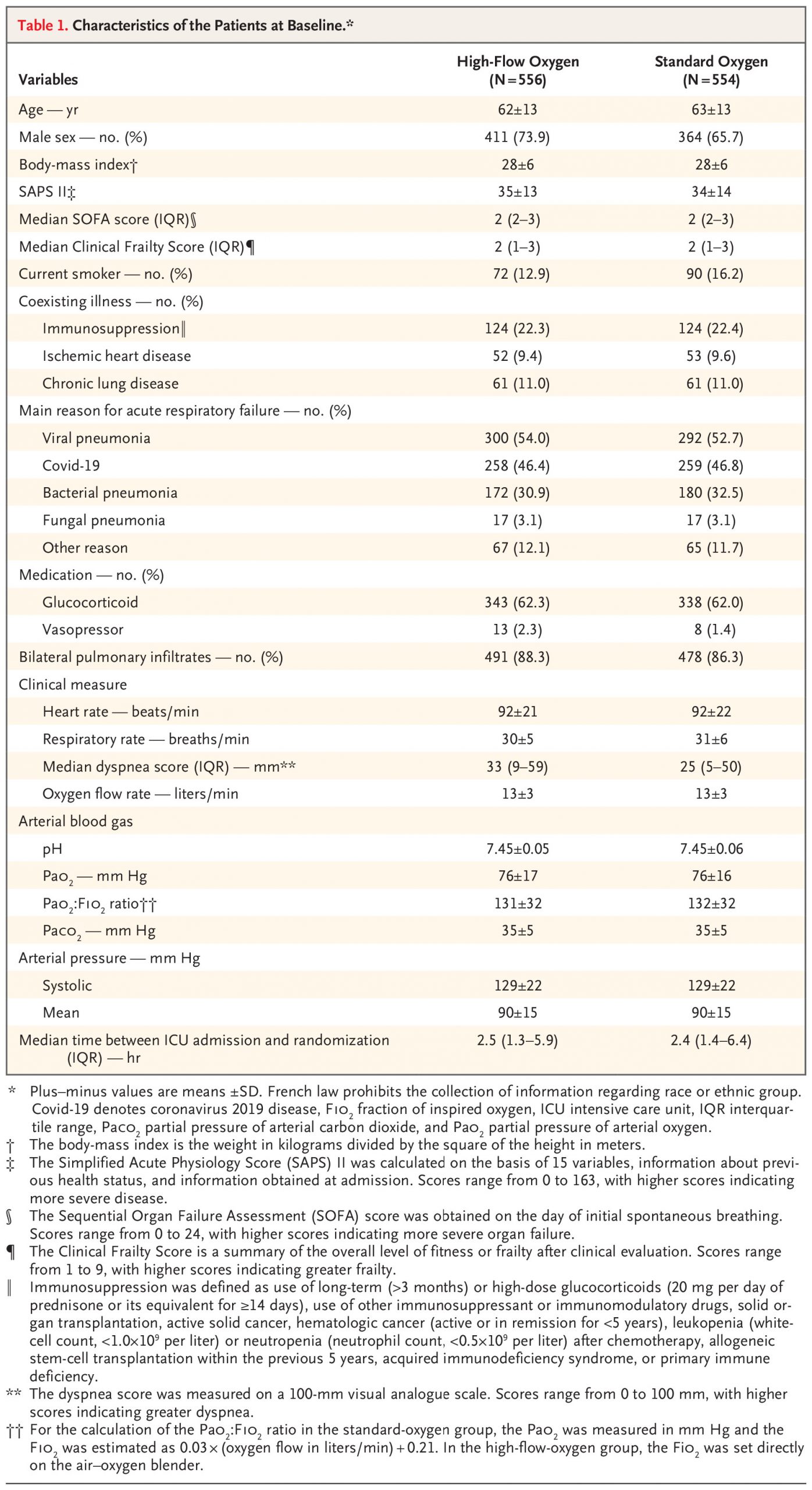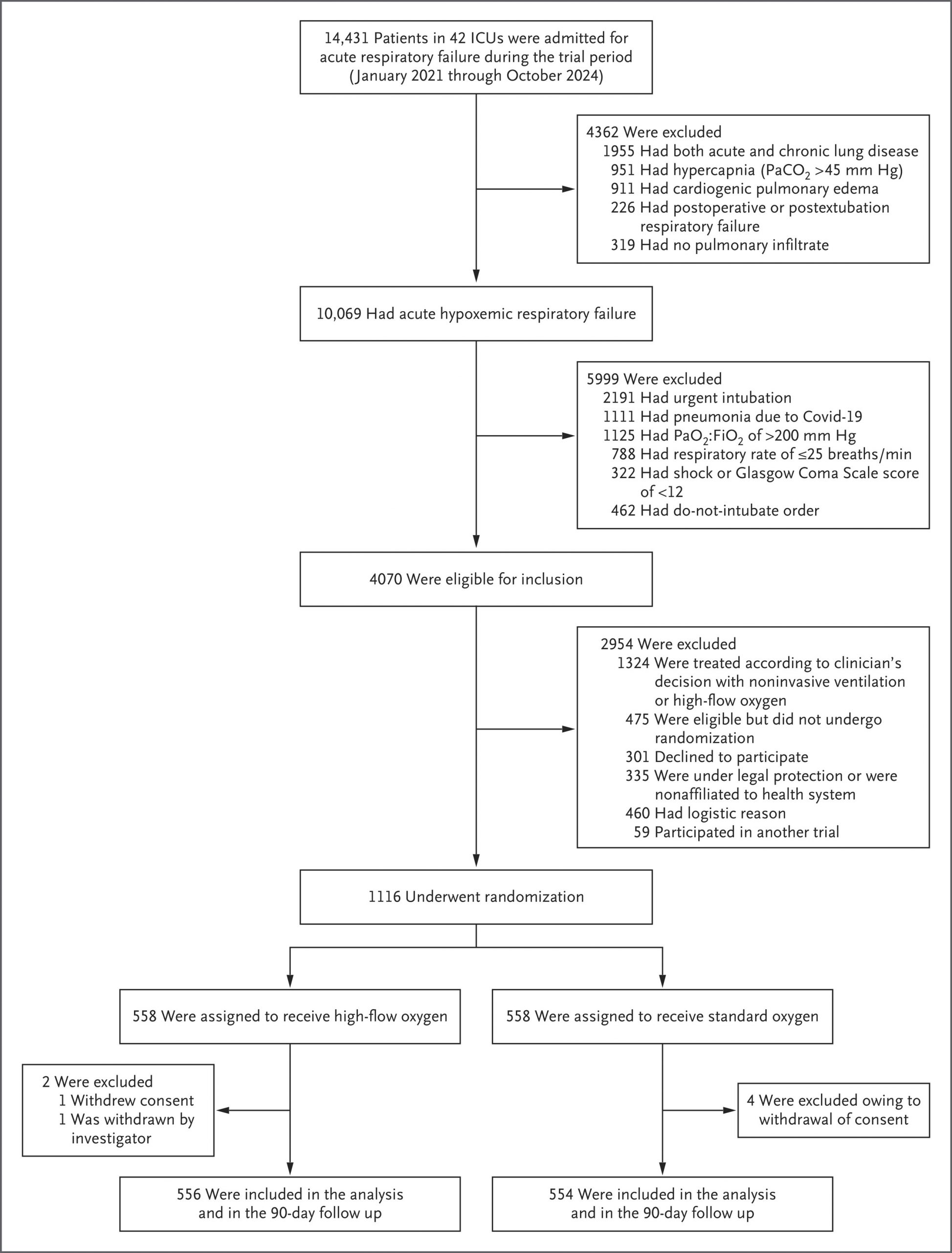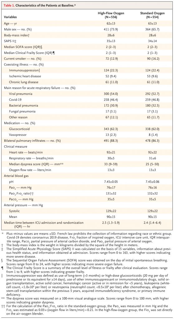 In this multicenter, open-label trial, we randomly assigned patients who had acute hypoxemic respiratory failure to receive high-flow-oxygen or standard-oxygen therapy. All the patients had a ratio of the partial pressure of arterial oxygen to the fraction of inspired oxygen of 200 or less, a respiratory rate of more than 25 breaths per minute, and pulmonary infiltrate on chest imaging. The primary outcome was death by day 28.
