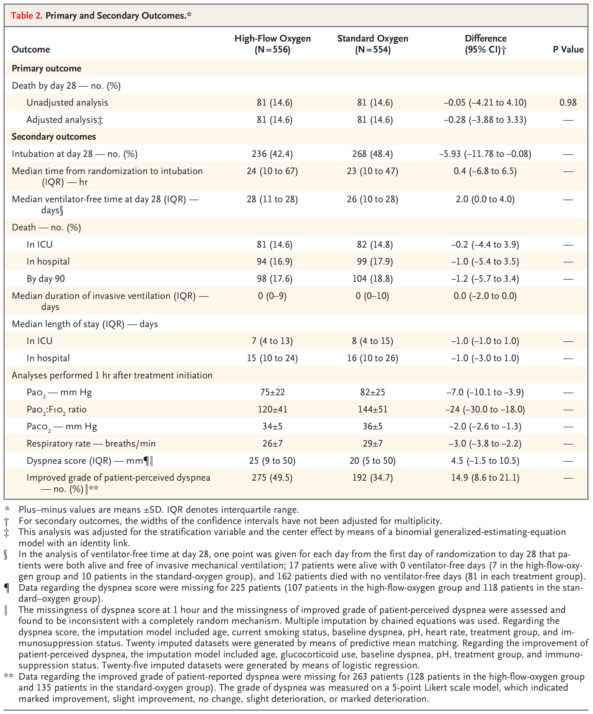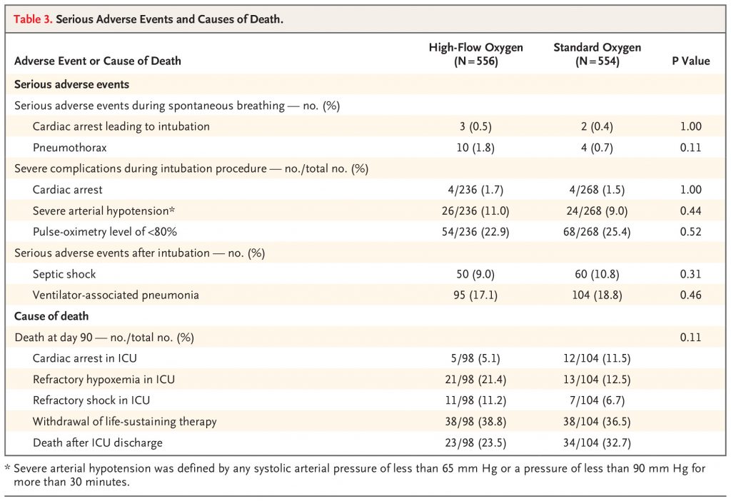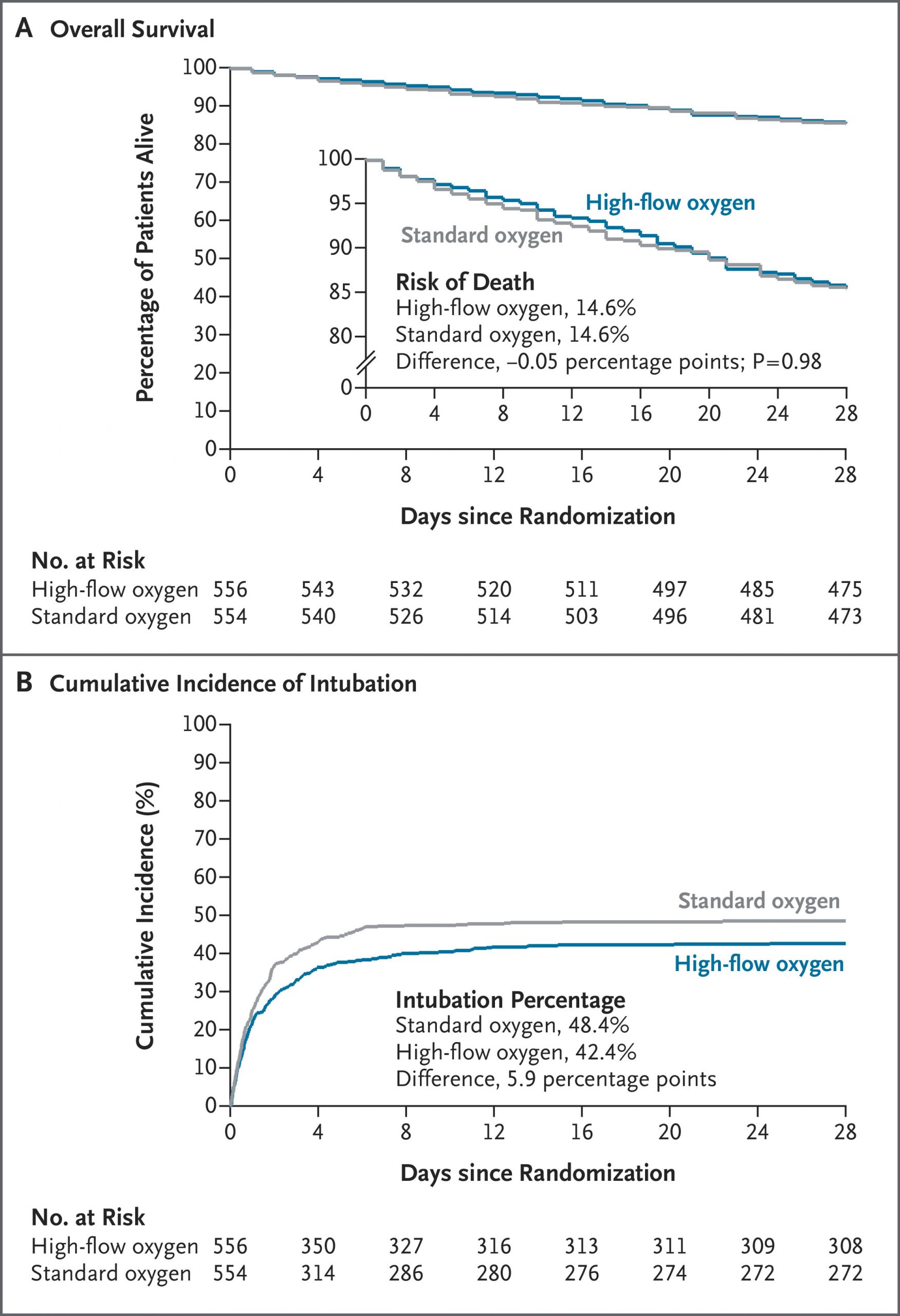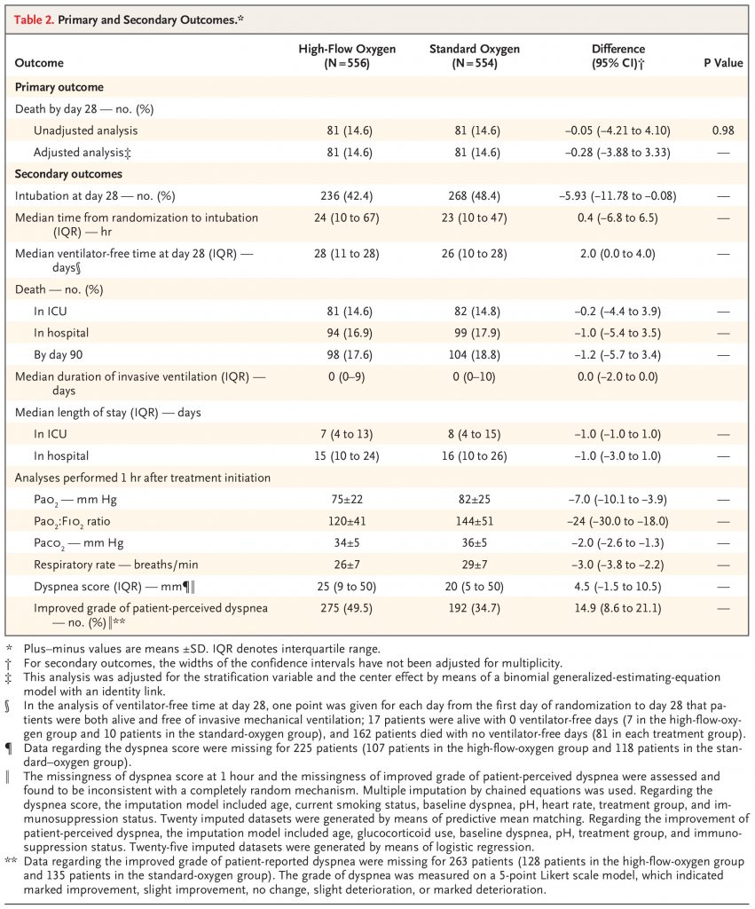 A total of 1116 patients underwent randomization. Of these patients, 1110 (556 in the high-flow-oxygen group and 554 in the standard-oxygen group) were included in the analysis. Mortality at day 28 was 14.6% (in 81 of 556 patients) in the high-flow-oxygen group and 14.6% (in 81 of 554 patients) in the standard-oxygen group (difference, −0.05 percentage points; 95% confidence interval [CI], −4.21 to 4.10; P=0.98). The incidence of intubation by day 28 was 42.4% (in 236 of 556 patients) in the high-flow-oxygen group and 48.4% (in 268 of 554 patients) in the standard-oxygen group (difference, −5.93 percentage points; 95% CI, −11.78 to −0.08). Serious adverse events (cardiac arrest or pneumothorax) occurred during spontaneous breathing in 13 patients (2.3%) in the high-flow-oxygen group and in 6 patients (1.1%) in the standard-oxygen group.