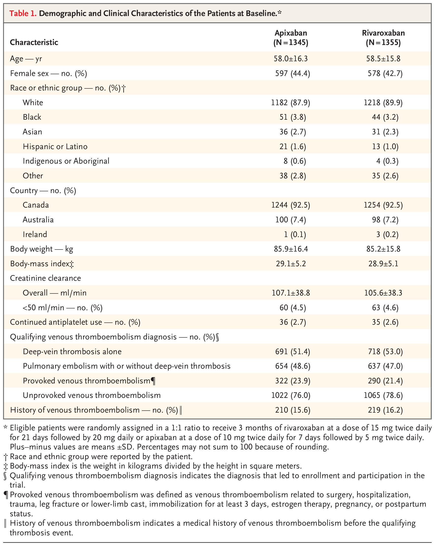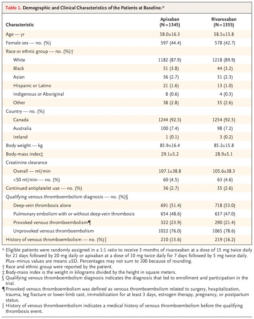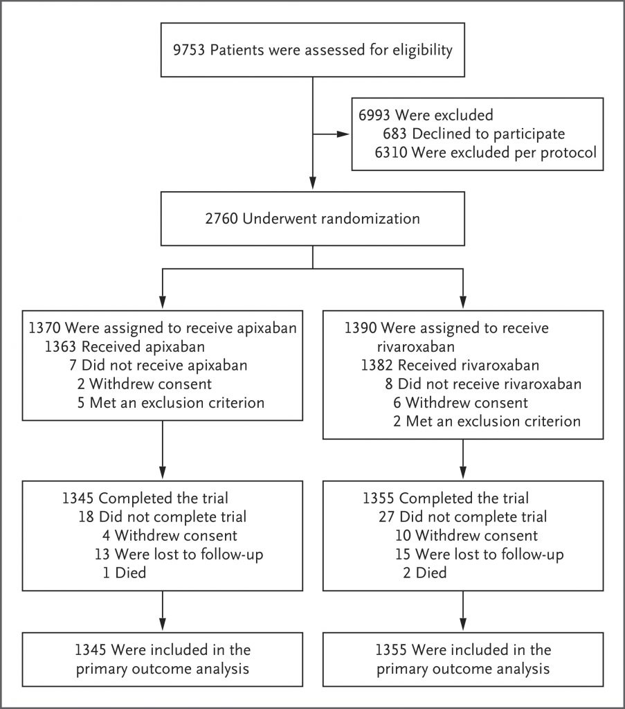 In an international trial with a prospective, randomized, open-label, blinded end-point design, we assigned, in a 1:1 ratio, eligible patients with acute symptomatic pulmonary embolism or proximal deep-vein thrombosis to receive apixaban or rivaroxaban for 3 months. Apixaban was given at a dose of 10 mg twice daily for 7 days followed by 5 mg twice daily, and rivaroxaban was given at a dose of 15 mg twice daily for 21 days followed by 20 mg daily. The primary outcome was clinically relevant bleeding, a composite of major bleeding or clinically relevant nonmajor bleeding, as defined according to the International Society on Thrombosis and Haemostasis, during the 3-month trial period. Secondary outcomes included death from any cause.