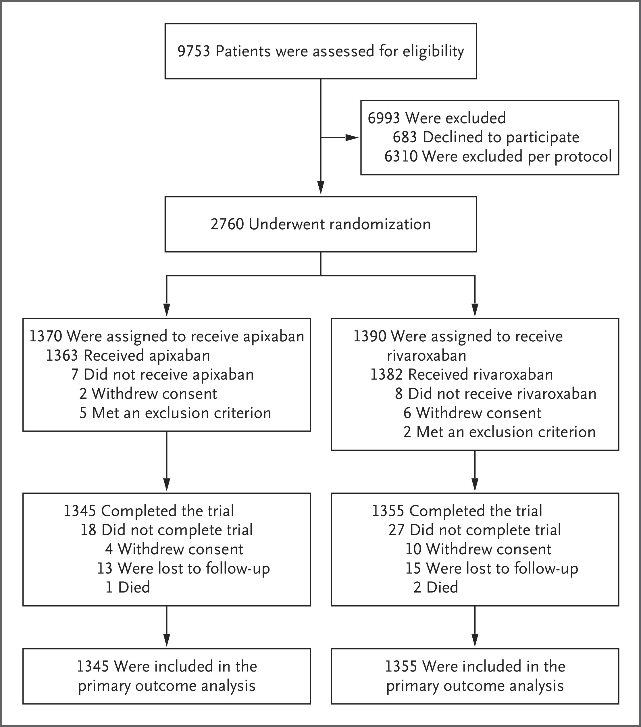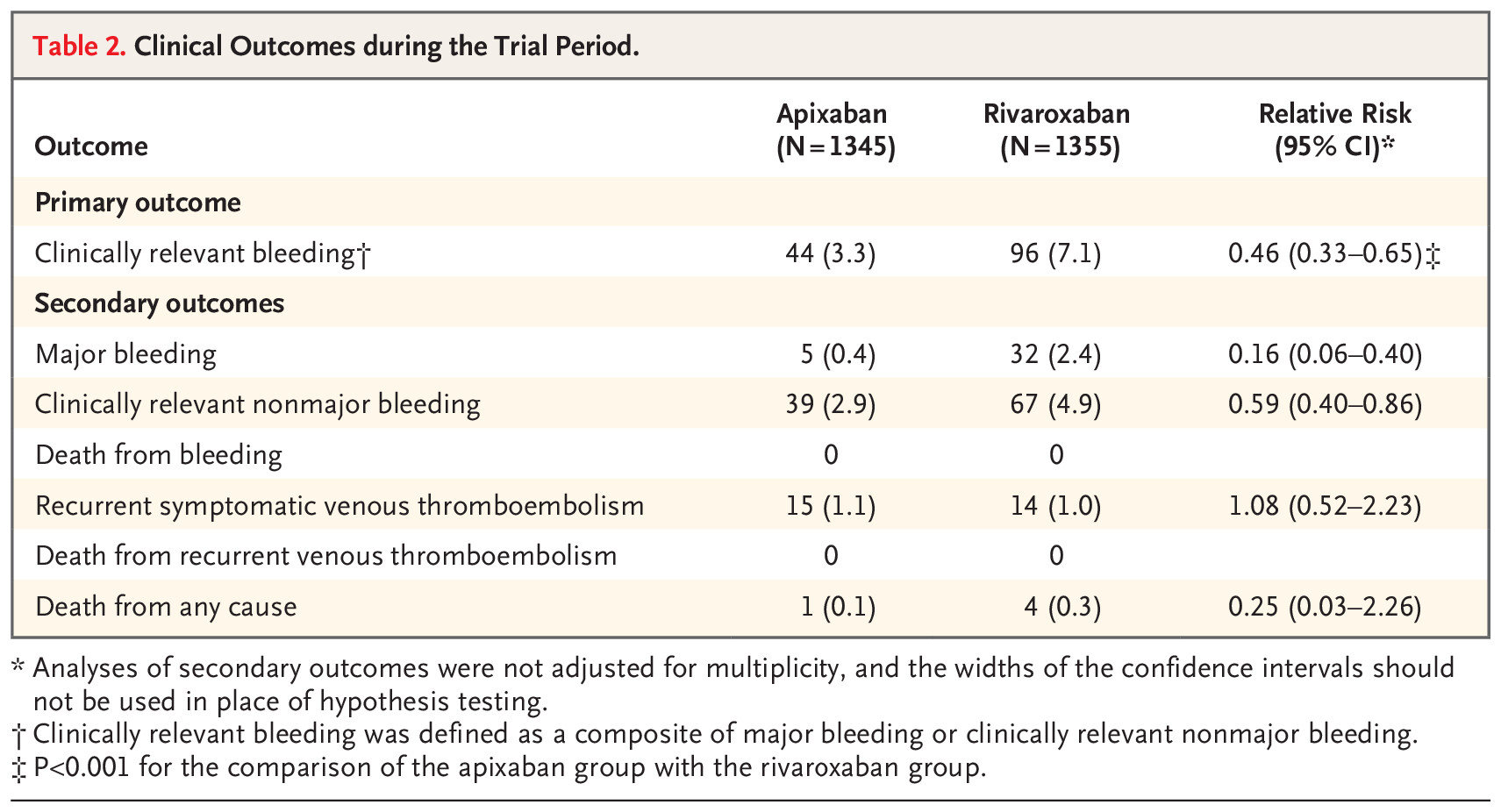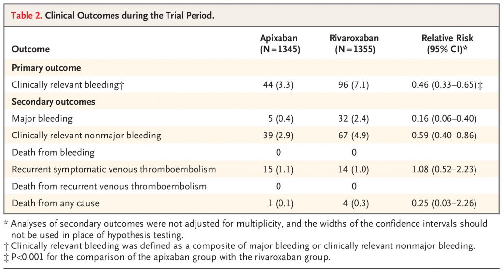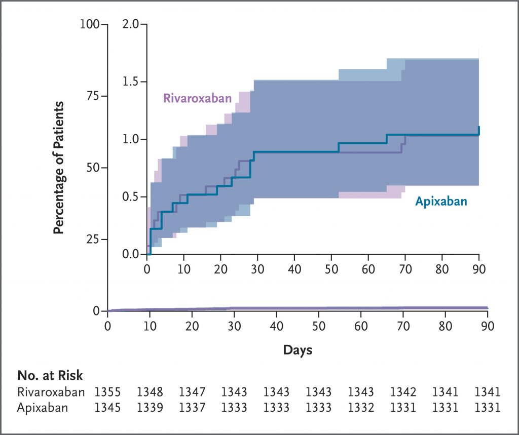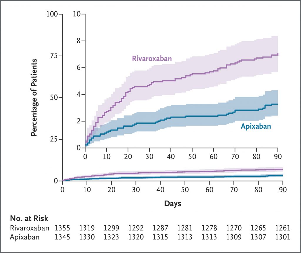 A total of 2760 patients underwent randomization: 1370 to the apixaban group and 1390 to the rivaroxaban group. A primary-outcome event occurred in 44 of 1345 patients (3.3%) in the apixaban group and 96 of 1355 patients (7.1%) in the rivaroxaban group (relative risk, 0.46; 95% confidence interval [CI], 0.33 to 0.65; P<0.001). Death from any cause occurred in 1 patient (0.1%) in the apixaban group and in 4 patients (0.3%) in the rivaroxaban group (relative risk, 0.25; 95% CI, 0.03 to 2.26). Serious adverse events unrelated to bleeding or venous thrombosis occurred in 36 patients (2.7%) in the apixaban group and in 30 patients (2.2%) in the rivaroxaban group.